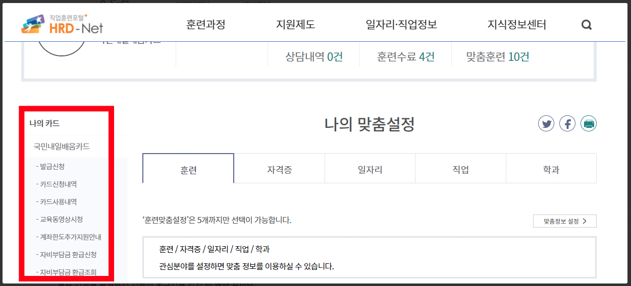 왼쪽으로 보시면 내일배움카드를 신청하실 수 있도록 메뉴가 있습니다
