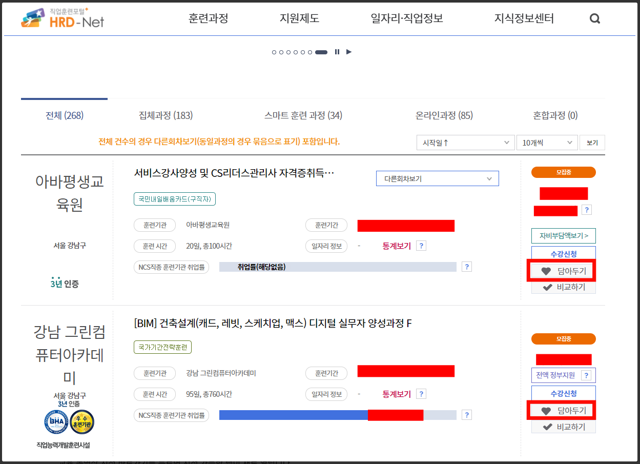 과목을 검색 후 오른쪽에 하트 모양으로 된 담아두기를 클릭하시면 담아두기가 완료됩니다. 담아두기를 통해서 골라주신 훈련과정을 관심 과정에 추가해주시면 내일배움카드 발급 신청 항목에서 선택 후 동영상 시청이 가능합니다.