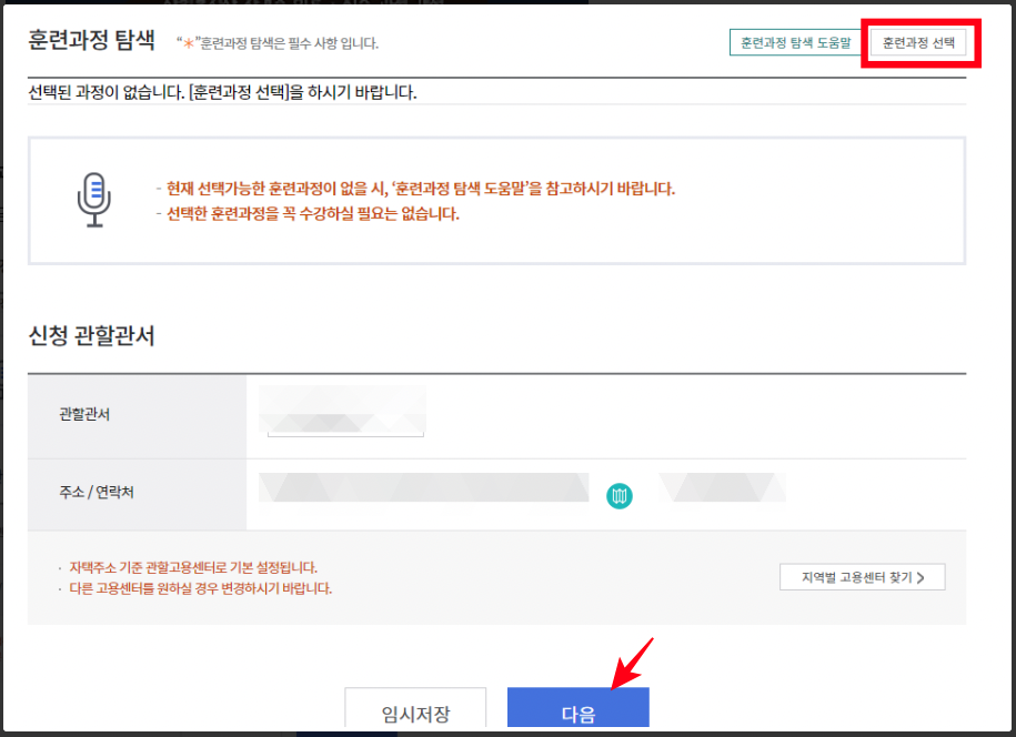 관심 있는 훈련과정으로 담아놓았던 항목 하나를 선택하신후 관할관서와 주소 연락처를 확인하고 다음을 눌러 신청을 합니다.심사가 완료되면 내일배움카드 발급이 진행되고 카드를 수령하신후 관심있는 강의 선택하고 결제 후 수강이 가능합니다.
