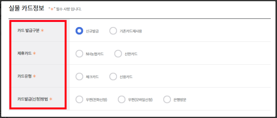 신청인의 기본정보를 입력하셔야 하고 영문명은 반드시 여권과 기재된 영문명과 같게 입력하셔야 합니다 실물 카드 정보 입력은 본인 명의의 은행계좌에서만 가능하고 이전에 발급된 카드가 있으시다면 기존 카드를 사용하셔도 되고 신규로 발급을 요청하실 수도 있습니다.