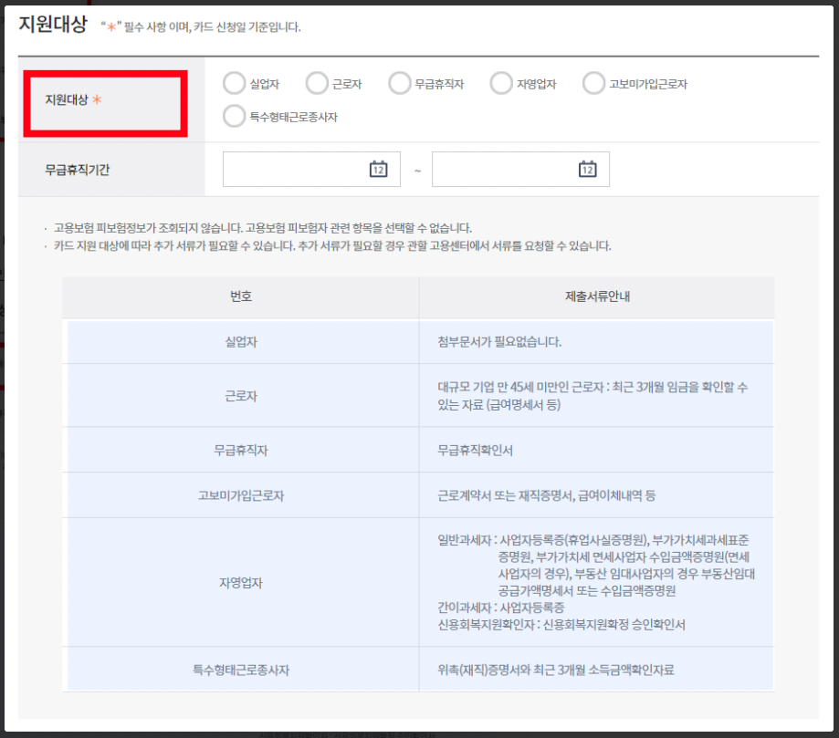 신청자격을 반드시 참고하시고 소득이나 회사의 규모 등에 따라 신청이 안되거나 급여명세서나 소득금액을 확인할 수 있는 추가 서류가 필요하실 수 있습니다 이런 경우는 관할 고용센터에서 연락이 오니 신경 안 쓰셔도 됩니다.