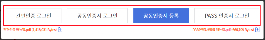 요즘은 간편하게 카카오톡이나 통신사 패스를 이용하실 수도 있고 금융인증서도 이용이 가능합니다 만약 공동 인증서를 사용 중이시라면 3번째 보이는 인증서 등록 메뉴를 통해 등록하고 쉽게 로그인이 가능합니다.